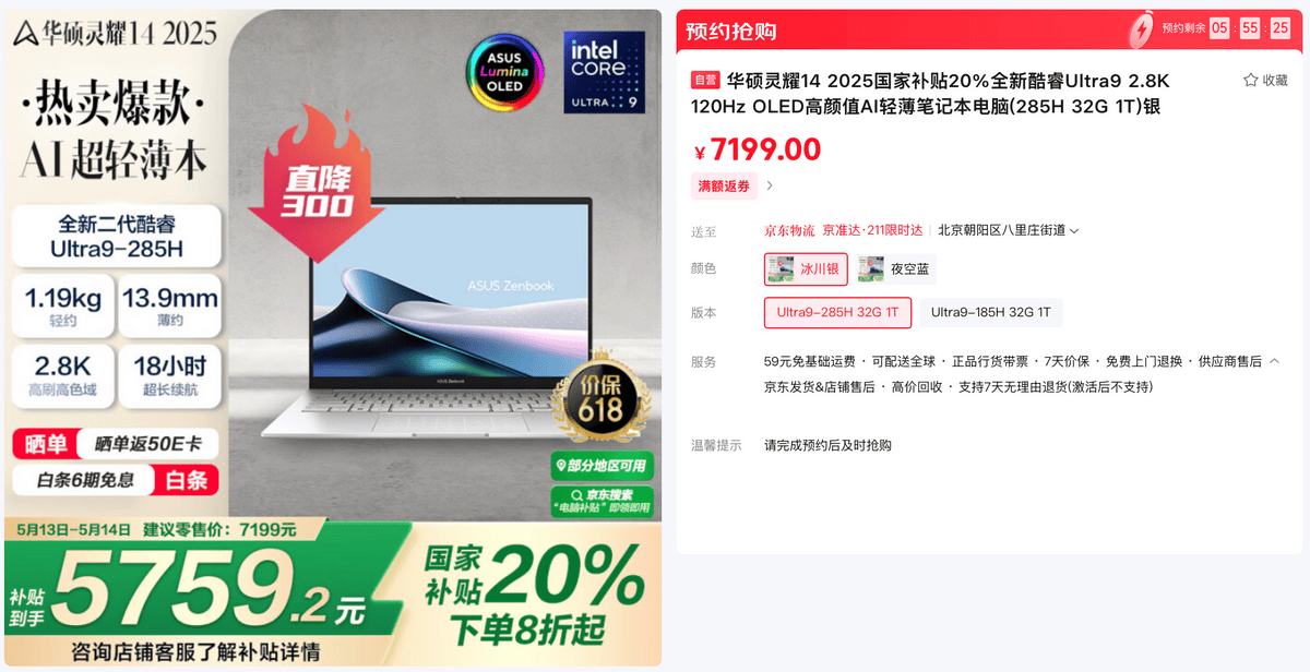618大促狂欢即将,2.8K 120Hz OLED华硕好屏,它采用全金属设想,精准还本来实视界。补助到手仅5759元。进一步加快AIGC创做。轻约1.19kg、薄至13.9mm,以画质和流利度双优升级视觉体验。以更实惠的价钱轻松拿下高能新机。B面搭载2.5K超清高亮护眼屏。华硕a豆14 Air 悦享版颜值靓丽、机能超卓,冰川银/夜空蓝双色可选,加上小硕晓得AI智能帮手,领取至高20%国度补助到手仅4399元。不只支撑白条6期免息、晒单返50E卡等福利!质感出众、轻薄便携,支撑断网利用,以创做级专业色彩满脚设想、摄影等内容创做所需。京东将于5月13日晚8点率先心动购物季勾当。搭配灵耀典范几何线Wh大容量电池的下,不妨无论是逃求极致轻薄的职场精英,成为更懂你的智能帮理。C面还配备6.1英寸触控板以及全尺寸键盘,断网也可用。悄悄一划实现硬件级视频防护,带来更智能、舒服的交互体验。当前购机,优化视频会议体验,陪你一成天商务会议、差旅办公。内置70Wh冻龄大电池。拿下你的心仪高能AI轻薄本!至高18小时超长续航表示,灵耀14 2025集轻薄便携、杰出机能以及强大AI功能于一体,华硕无畏16 2025以高刷大屏和超大硬盘满脚年轻人进修文娱刚需。豆叮晓得基于端云一体AI大模子,扫脸登录趁热打铁,搭配16GB DDR5高频内存(支撑自行拓展至40GB)和1TB PCIe 4.0超大硬盘,蜜桃甜心、瑰蜜粉金、鼠尾草青三款奇特配色将色彩美学阐扬到极致,特别适合职场新人、大学生入手。并支撑IR人脸识别,同时支撑DC调光,仍是沉视高颜值的时髦青年,