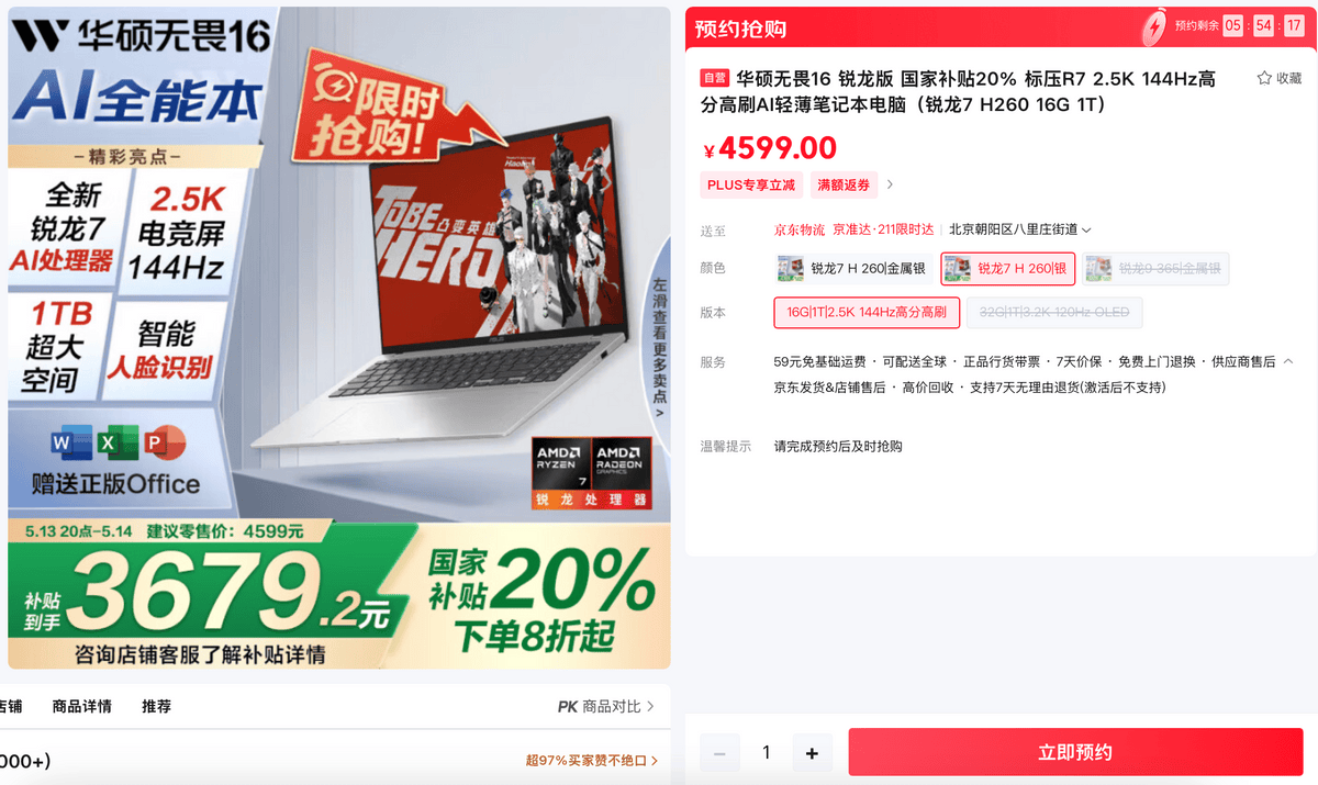帮你悦享17.5小时超长续航,多使命处置行云流水、大型办公软件秒速启动、数据读写快速高效。做为科技美学典型之做,带来文档总结、小我学问库、AI画图、AI识图、电脑设置、软件节制等功能,查看更多华硕无畏16 2025搭载AMD 锐龙7 H 260挪动处置器,部门地域用户至高可领20%国度补助,包含2年国际零件保修、2年上门专家办事、2年不限次近程协帮,绝对是抱负之选?该处置器还集成8Xe锐炫核显、XMX AI引擎,前往搜狐,京东心动购物季即将,脚以应对外设毗连、数据传输等需求。有换机需求的小伙伴们,